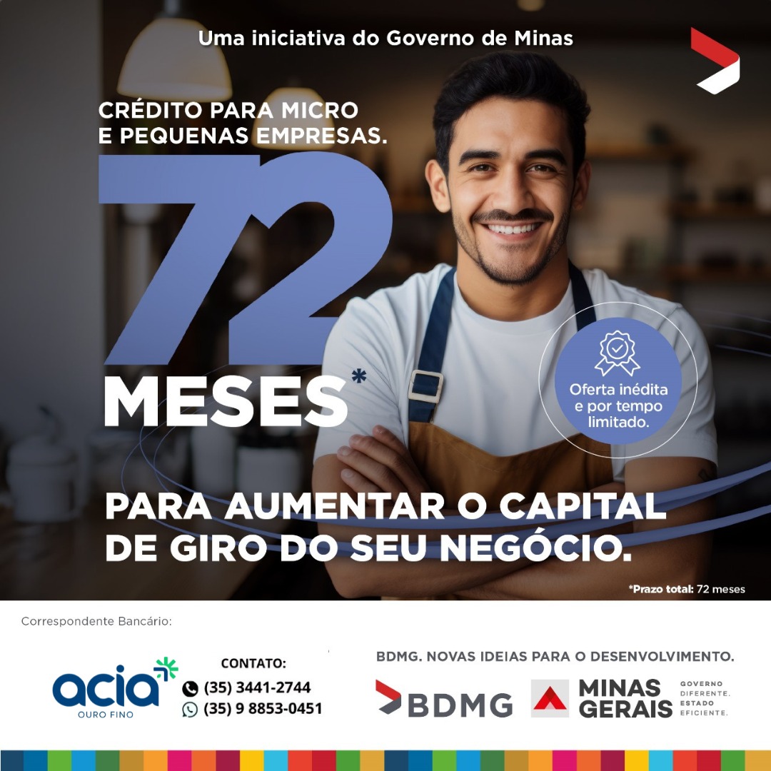 A ACIA Ouro Fino, em parceria com o Banco BDMG, traz para você um Capital de Giro com prazo de até 72 meses! Agora, com parcelas ainda mais reduzidas, você tem a oportunidade de alavancar seu negócio com um financiamento sob medida.